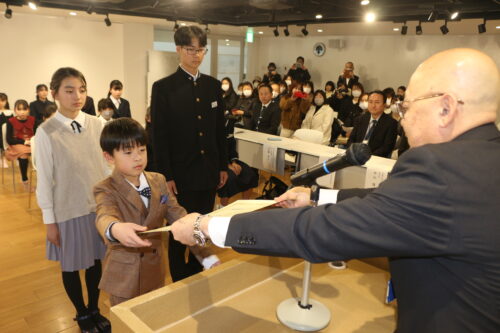 鬼の顔を貼り付けた小さな的を狙う鬼的厄払いは準会員の高校生が立射し、射抜いた的を記念品として受け取っていた。
